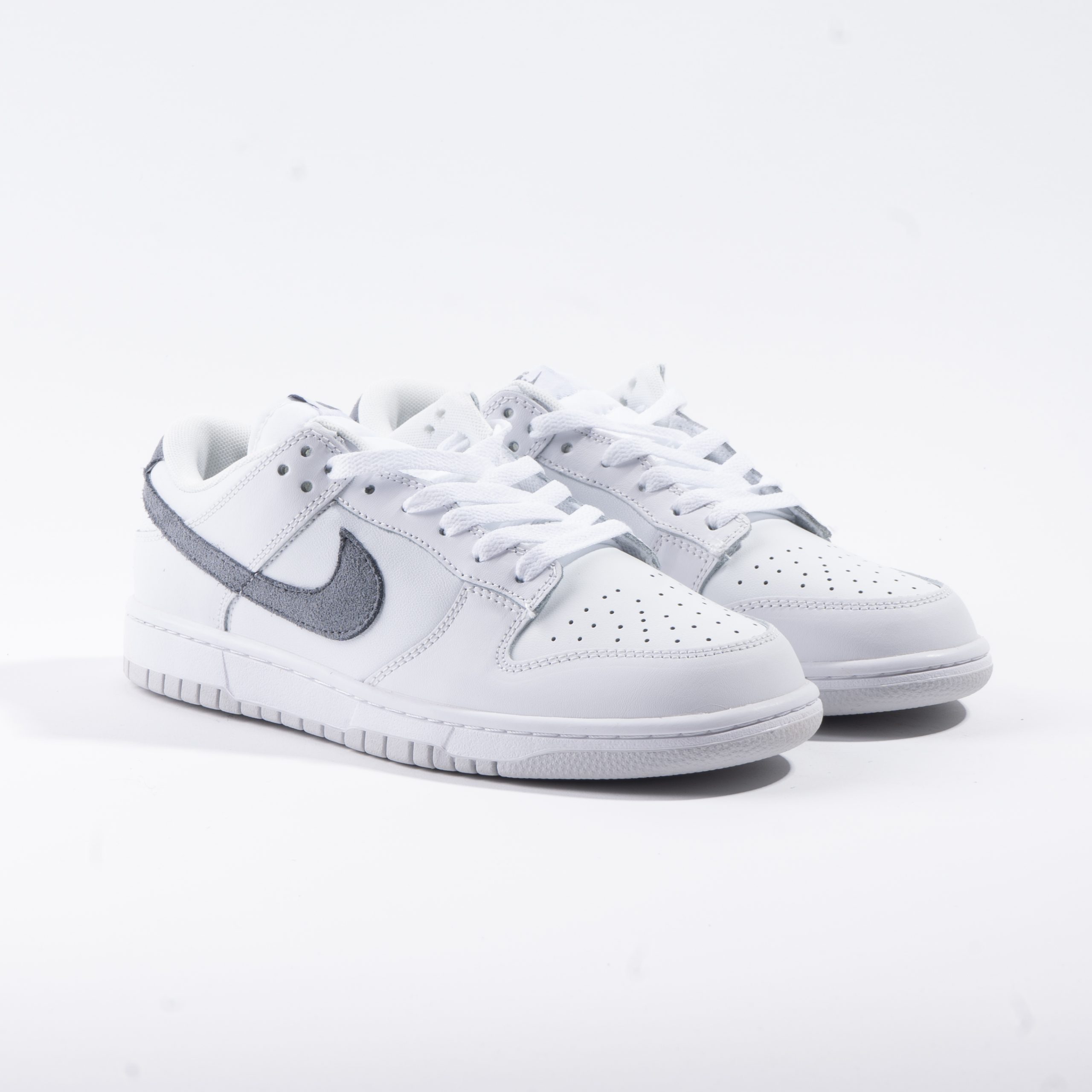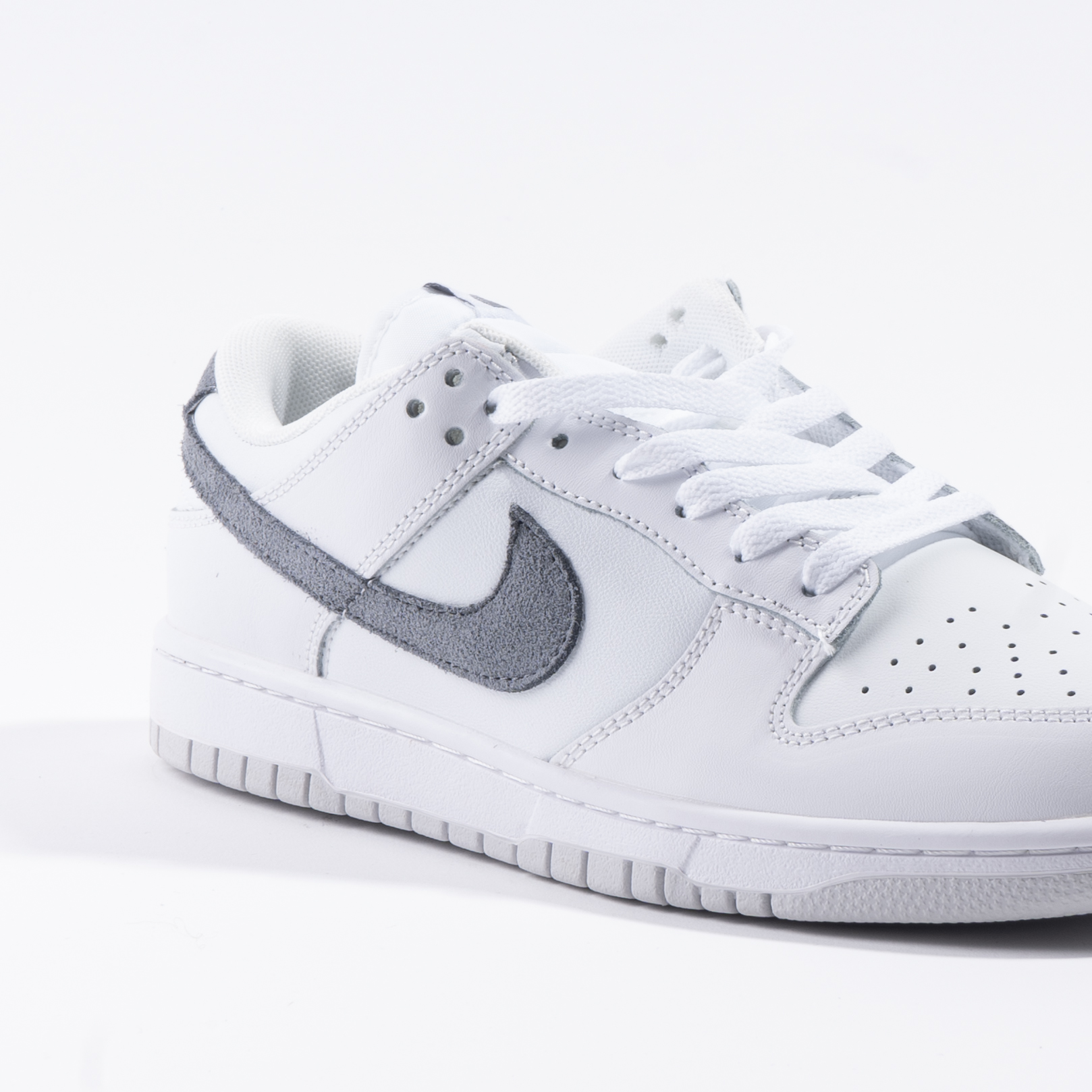اسنیکر نایک دانک ساق کوتاه سفید و طوسی از متریال فوم ساخته شده. طراحی اسووش کفش با متریال جیر و استفاده از رنگ طوسی که جزو رنگهای محبوب امسال بوده این کفش رو به یکی از اسنیکرهای جذاب ۲۰۲۵ تبدیل کرده ، غالب بودن رنگ سفید تو این مدل باعث میشه به راحتی با هر استایلی قابل استفاده باشه